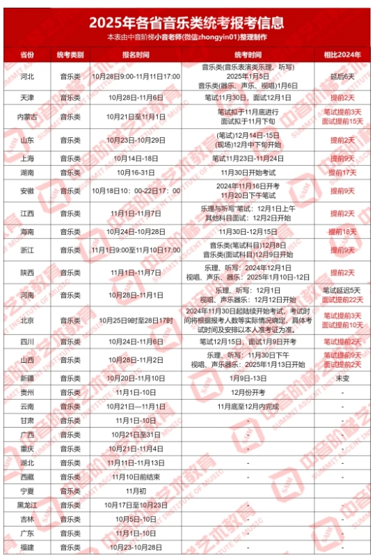 从目前已公布25年统考时间的省份来看,继2024届统考时间提前之后,2025届艺术统考时间继续提前。其中,2025年音乐类别统考时间提前的有5个省份,分别是北京、江西、陕西、海南、内蒙古、浙江、山东、上海、安徽。从统计来看,提前最多的达22天!河南2025年音乐类统考(面试)将于2024年12月12日进行,较2024年就提前了22天。