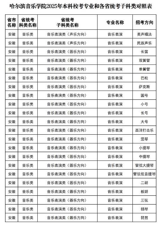 各位考生:根据教育部相关文件要求,现将哈尔滨音乐学院2025年本科校考专业和各省统考子科类对照情况公布如下,请各位考生务必仔细阅读对照表中各专业在自己所在省对应的子科类,满足报考条件的考生再报考相关专业,若因为省统考不合格,造成后期我校无法上报合格成绩给省级招办备案,或无法录取到相关专业的责任,由考生自行承担。对照表详见附件。说明:若一个专业对应多个子科类,则考生只需参加其中一个子科类的省级统考并取得统考合格(或通过统考本科合格线)即可。附件:哈尔滨音乐学院2025年本科校考专业和各省统考子科类对照表.pdf哈尔滨音乐学院2024年10月。7aC音乐培训_音乐艺考培训学校-