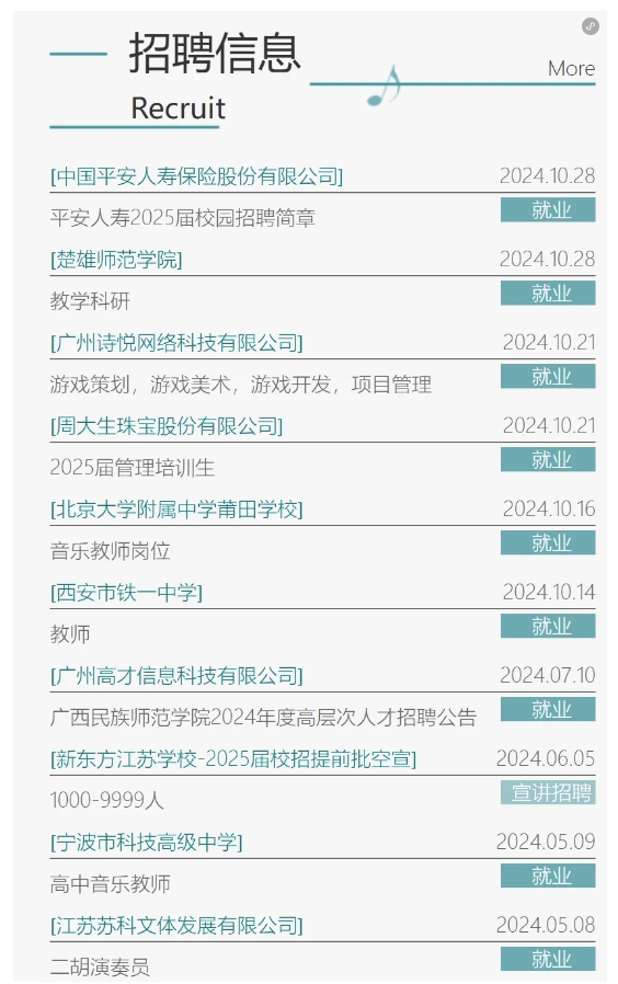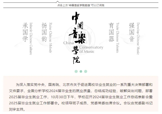 这不,近日中国音乐学院官微发布了《2024届毕业生就业工作总结表彰会暨2025届毕业生就业工作部署会议》的文章,学校帮助音乐生逐步落实就业问题,音乐生不仅可以进教育体系里面,还可以考公、考编、考研、考军队文职等岗位,也可以灵活就业,进入国企、央企等岗位。音乐生考哪个音乐学院比较好?未来有哪些岗位可以选择?11大音乐学院的就业质量如何?下面小音老师将一一为大家讲解。