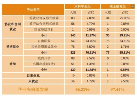 星海音乐学院某一年整体就业率在95%左右,其中本科毕业生去向以协议和合同就业为主,灵活就业次之,升学也成为部分音乐生的主要选择。研究生的去向以灵活就业和协议和合同就业为主,小部分音乐生会选择继续升学。