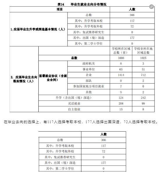 2023 年共有本科毕业生 3526 人,实际毕业人数 3386 人,毕业率为 96.03%,学位 授予率为 100%。 截至 2023 年 8 月 31 日,学校应届本科毕业生总体去向落实率达 80.06%。毕业生最主要的毕业去向是企业,占 78.42%。升学 366 人,占 10.81%,其中出国(境)留学 177 人,占 6.53%。