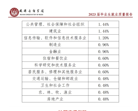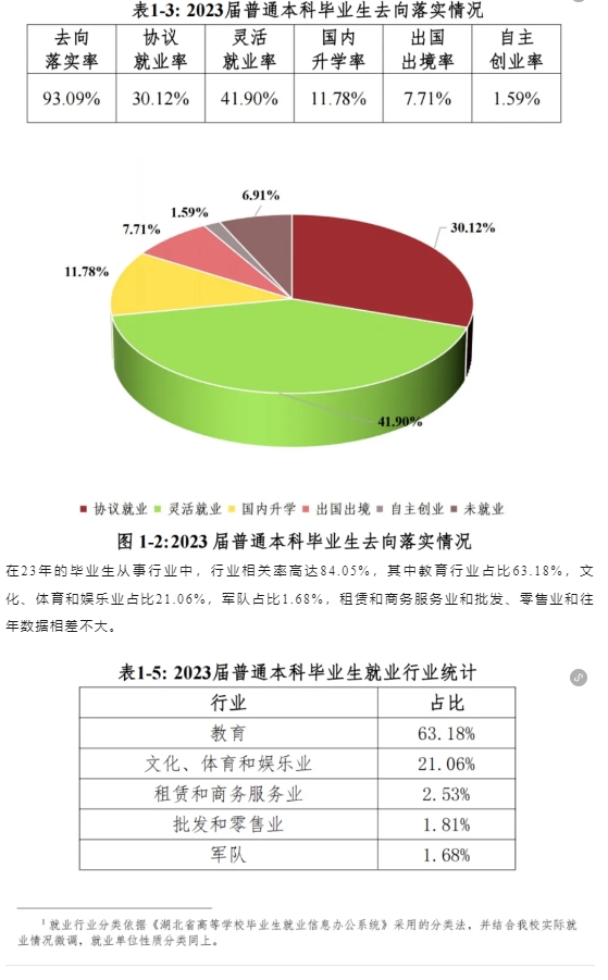 武汉音乐学院2023届普通本科毕业生(以 下简称毕业生)毕业去向落实率达到 93.09%。在就业类别中,灵活就业的毕业生为 41.90%,协议就业占比 30.12%,国内升学率占比11.78%,出国出境率占7.71%,自主创业率也往年差不多。