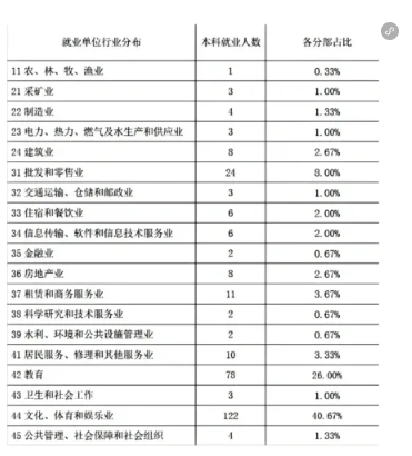 学校为音乐生从线上和线下两大渠道为音乐生提供就业岗位与信息,以教育、文娱、社会岗位为主。其次,本科生的就业岗位以国有企业、其他事业单位、中等、初等教育单位为主。