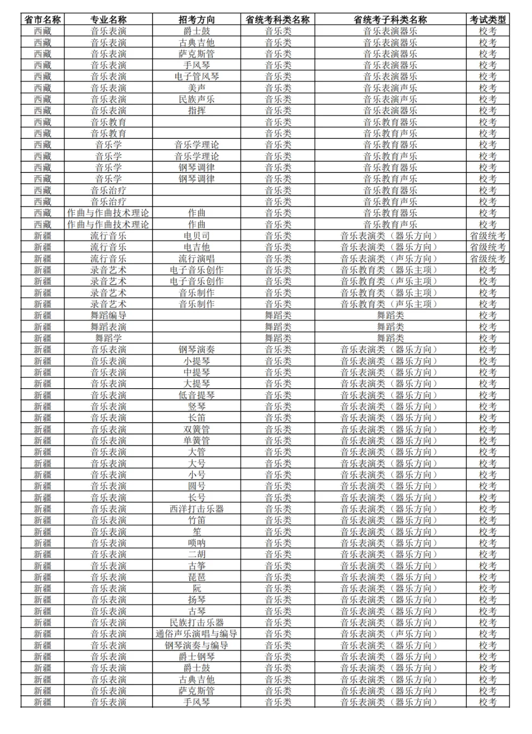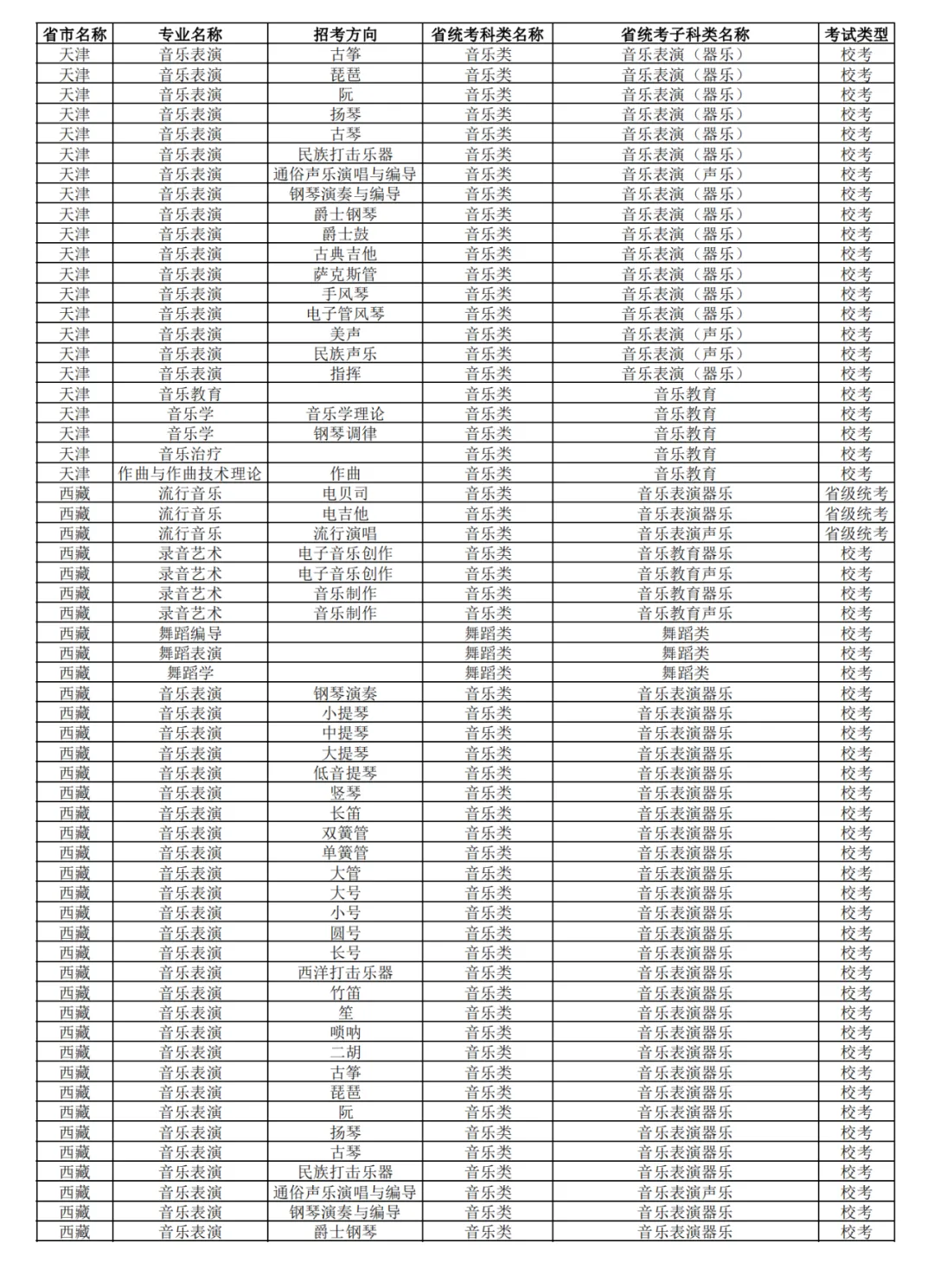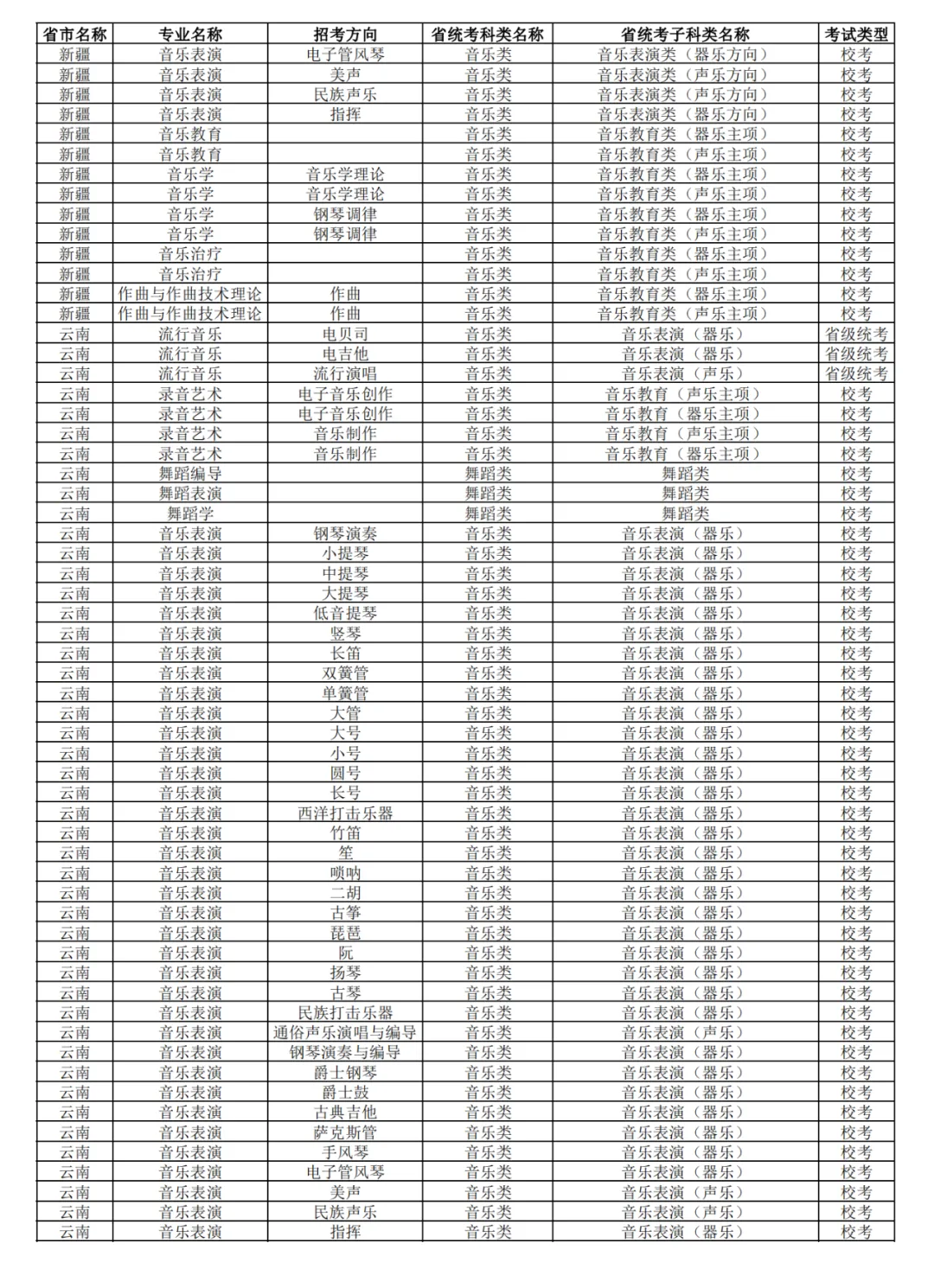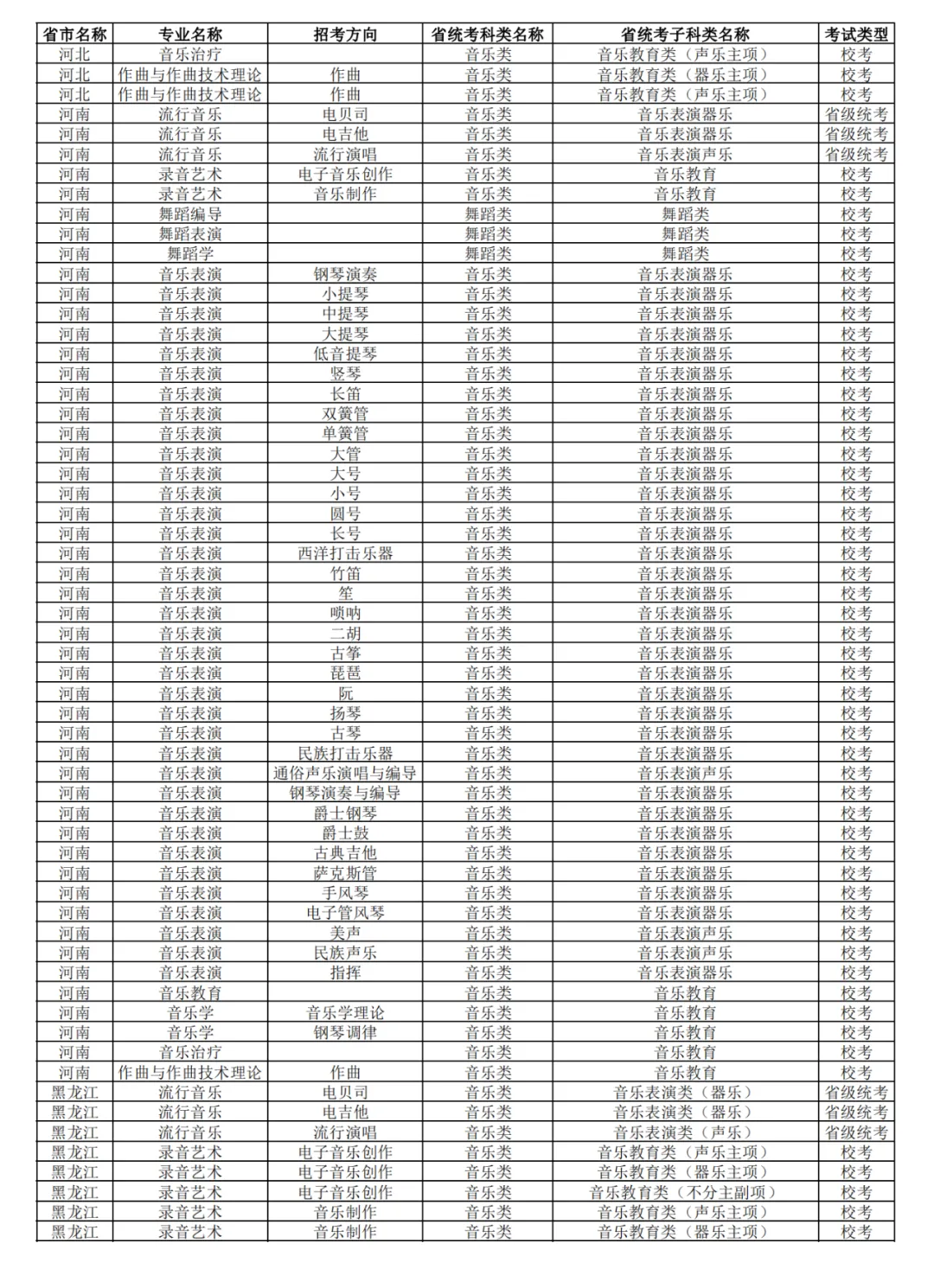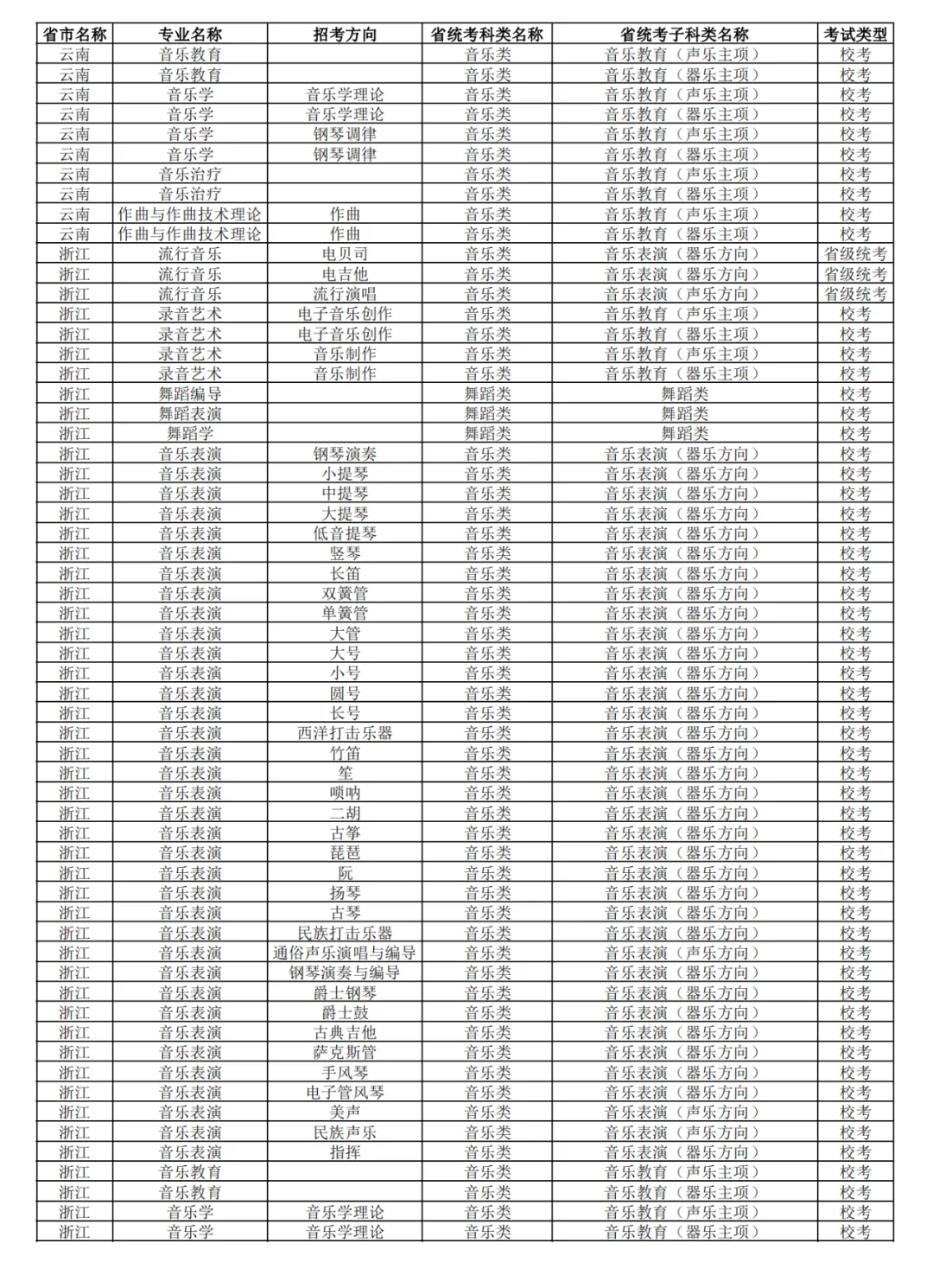 武汉音乐学院2025年本科招生专业和各省统考子科类对照表