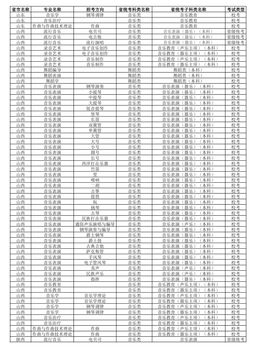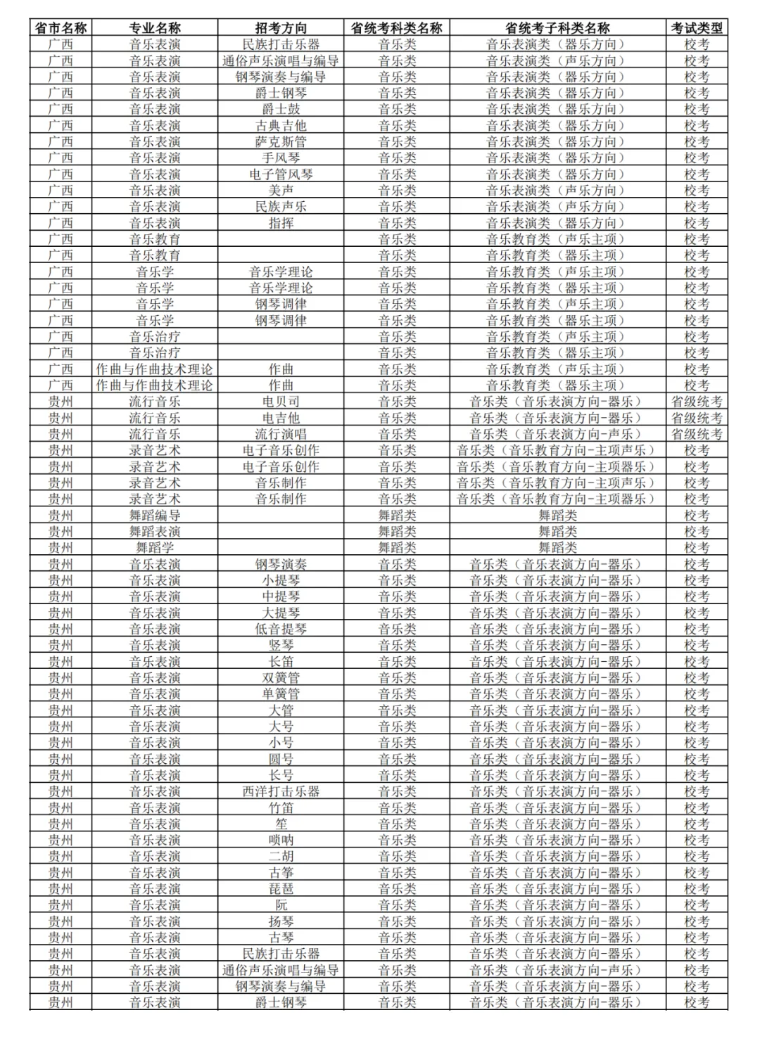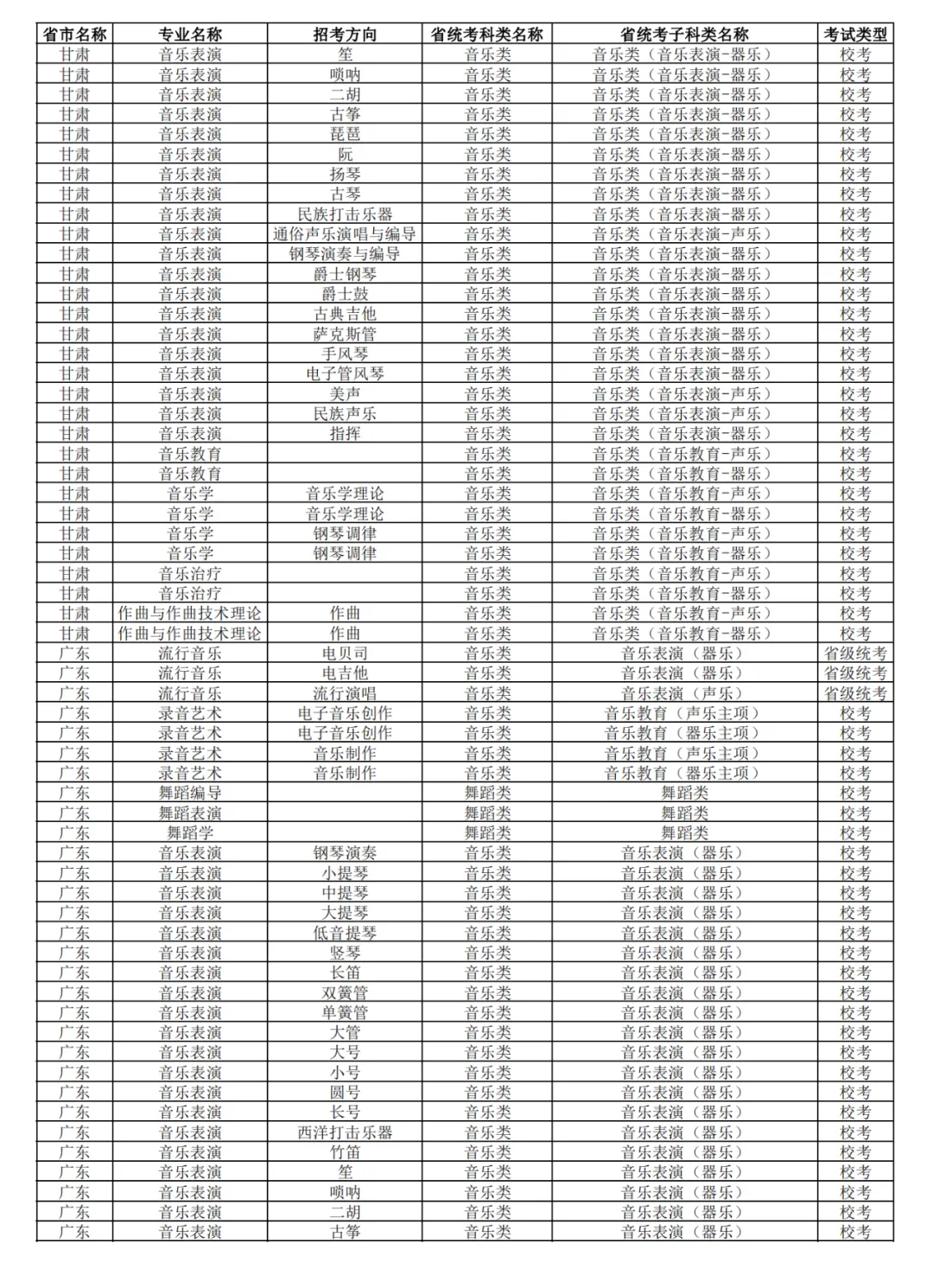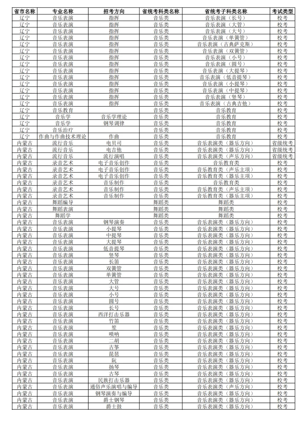 武汉音乐学院2025年本科招生专业和各省统考子科类对照表