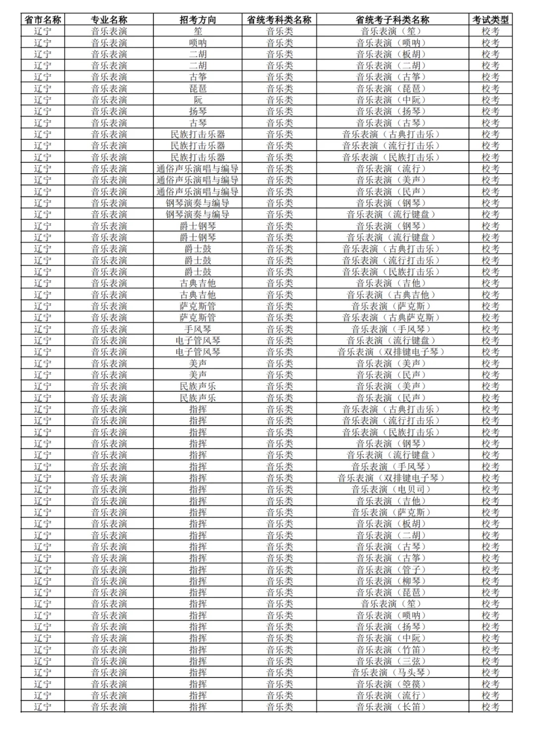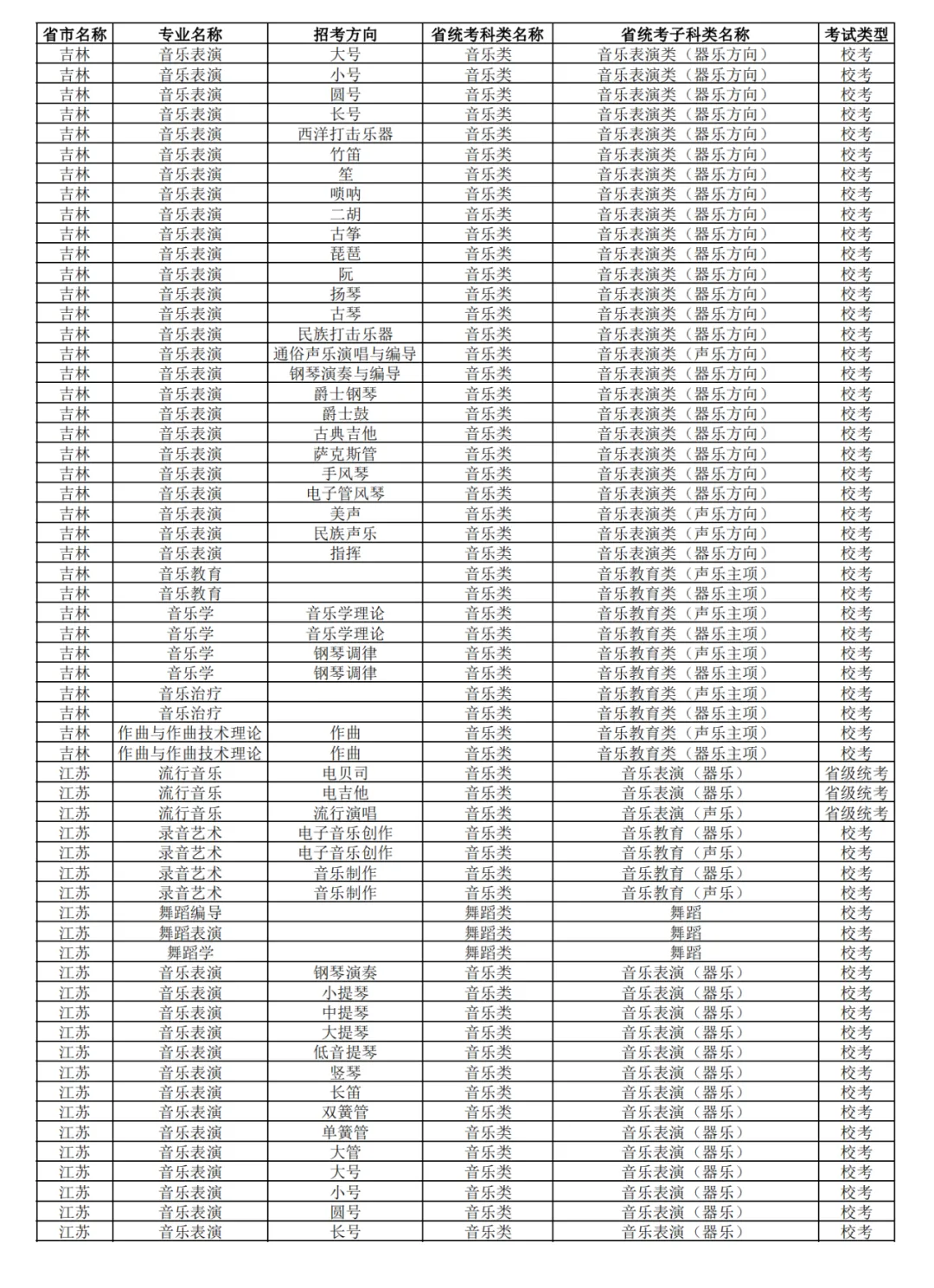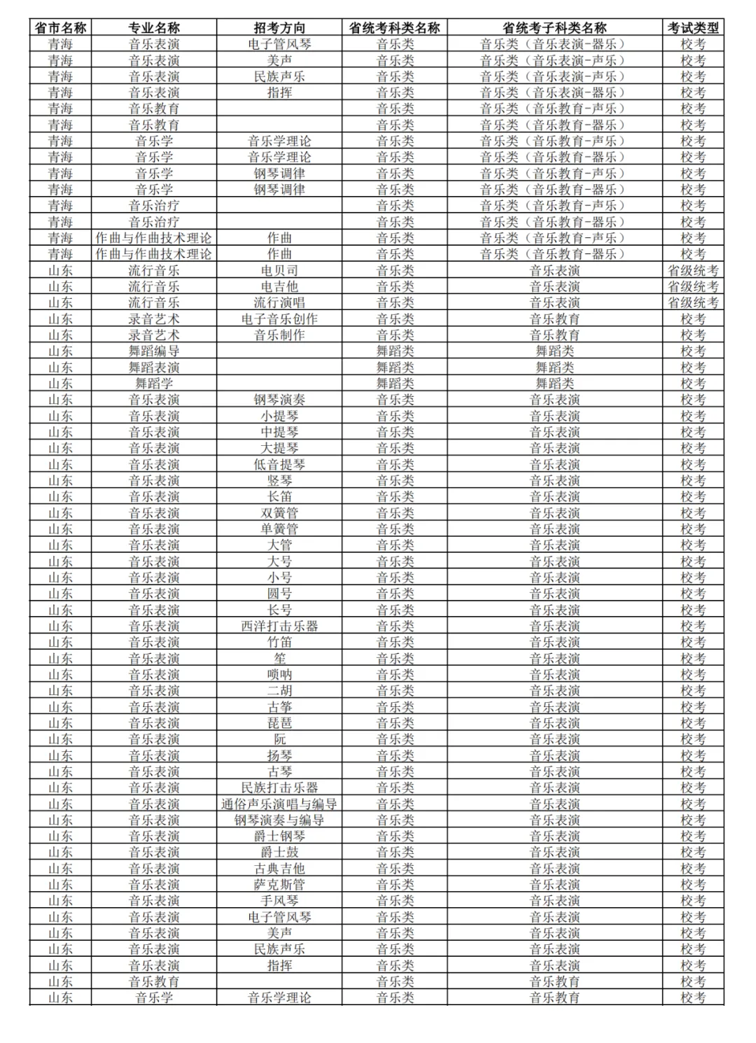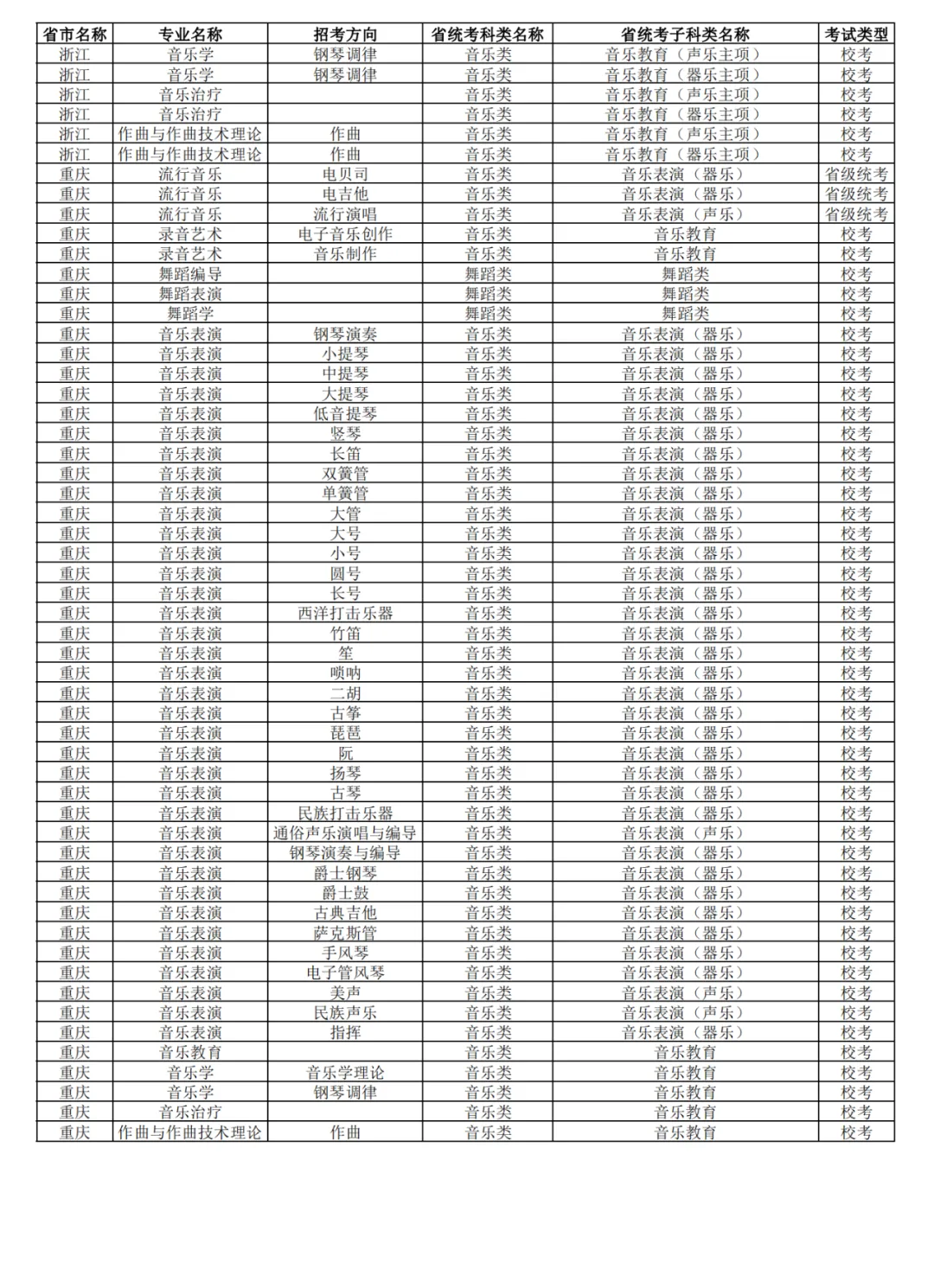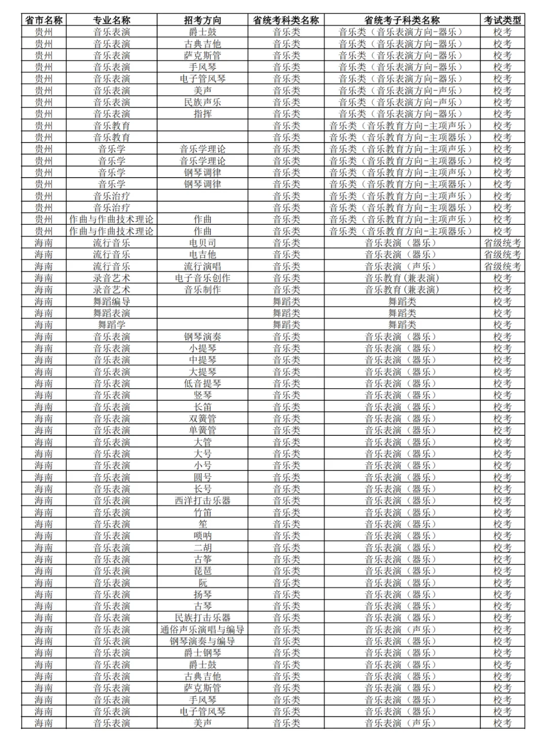 武汉音乐学院2025年本科招生专业和各省统考子科类对照表