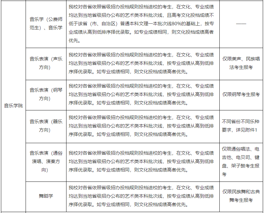 (四)报考音乐学、音乐表演专业的考生,须参加生源省组织的音乐类专业省级统考,且成绩达到省级统考本科合格分数线。报考音乐学专业的考生要求高考文化投档成绩不低于该省(市、自治区)普通本科文理一本批次线80%;报考音乐表演专业的考生要求高考文化投档成绩不低于当地省级招办公布的艺术类本科批次线。
