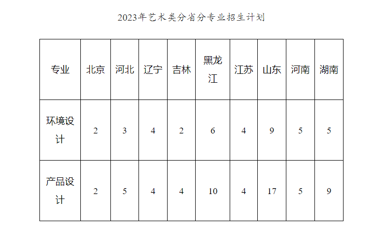 学校2023年艺术类专业面向北京、河北、辽宁、吉林、黑龙江、江苏、山东、河南、湖南9个省(市)共计招生100人,其中环境设计专业招生40人,产品设计专业招生60人。