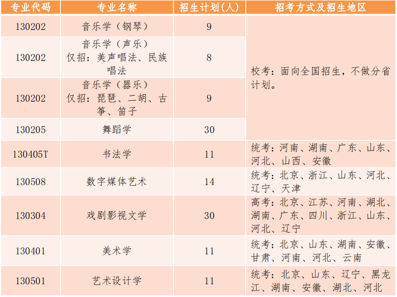注:招考方式为高考的专业,直接使用高考成绩录取;招考方式为统考的专业,使用对应艺术类省级统考成绩及高考成绩录取。具体招生计划以各省份招生考试机构公布为准。