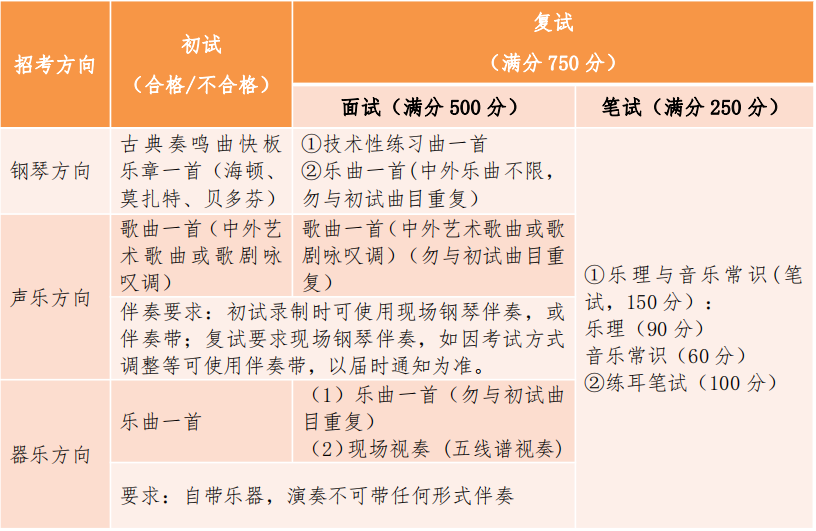 说明:1)考试曲目以网上报名时在个人陈述中所填报的曲目为准,报名时务必准确填写,现场考试时不得自行更改。2)考生如缺考上述任何一项考试,将取消合格资格。3)钢琴、声乐、器乐方向一律要求背谱演奏/演唱。