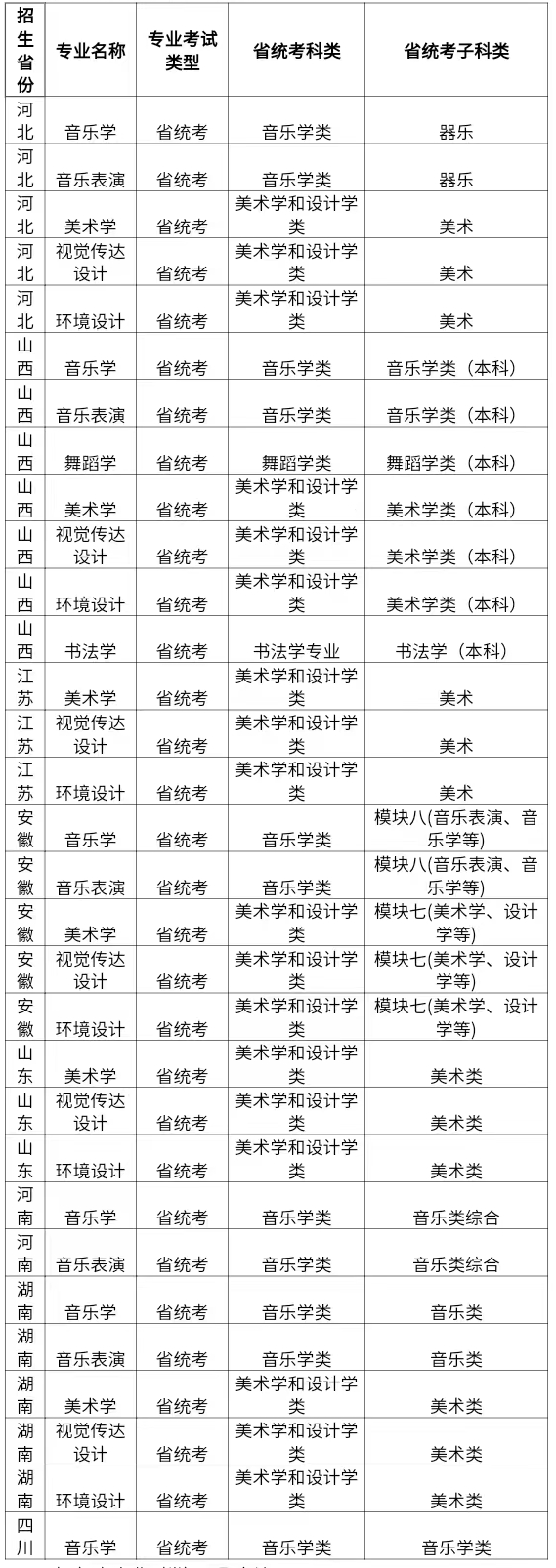 (二)学校使用生源地省级统考成绩。所有报考我校艺术类专业的考生须参加生源所在省份组织的统考。统考科类详情如下: