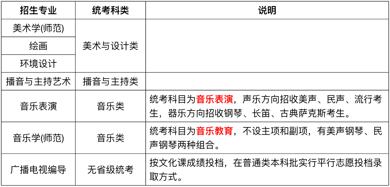 说明:音乐表演专业统考科目为音乐表演,声乐方向招收美声、民声、流行考生,器乐方向招收钢琴、长笛、古典萨克斯考生,各省具体招考方向以考生所在地省级招生考试机构公布为准。