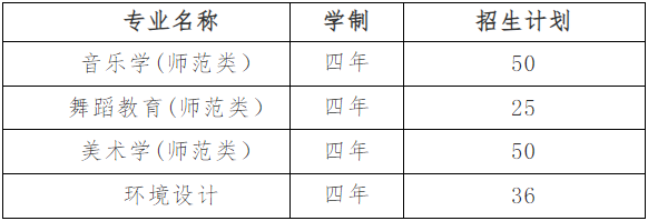 2024年我校音乐学(师范类)、舞蹈教育(师范类)、美术学(师范类)、环境设计专业拟招生161人,具体分省招生专业、计划以各省(自治区、直辖市)招生主管部门公布的招生计划为准。