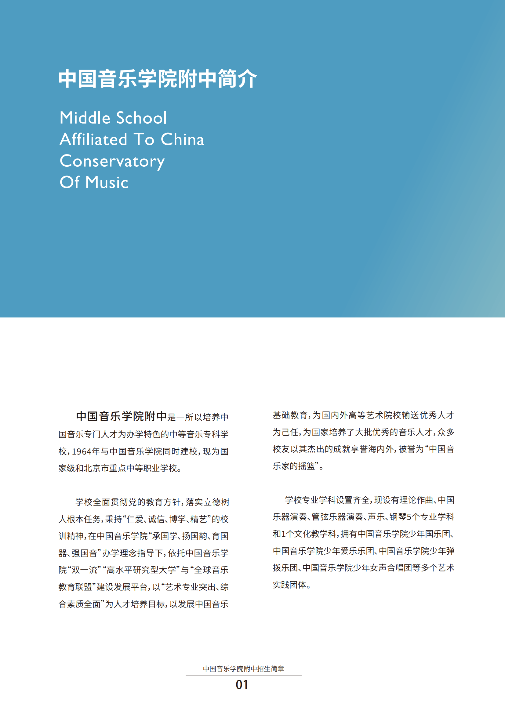 中国音乐学院建立于1964年,是国家“双一流”建设院校、北京市“高水平研究型大学”建设院校、“全球音乐教育联盟”秘书处学校。学校坚持党的领导,坚持社会主义办学方向,坚守弘扬与发展中华优秀传统音乐文化的办学初心,以“承国学、扬国韵、育国器、强国音”为办学理念,以建设中国特色世界一流高等音乐学府为办学目标,倡导和建设“中国乐派”,独具中国音乐教育和研究特色,多年来被誉为“中国音乐家的摇篮”“中国音乐的殿堂”。