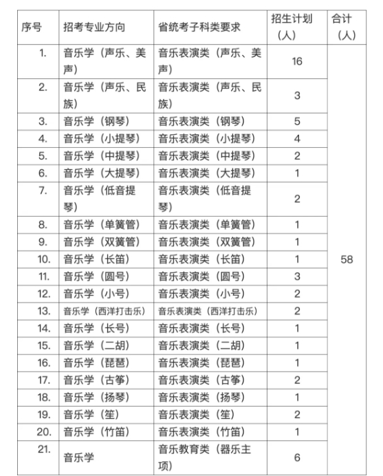 注:表格中第21项“音乐学”包含音乐学理论、作曲两个方向,学生入校后按照学院相关规定进行分流。