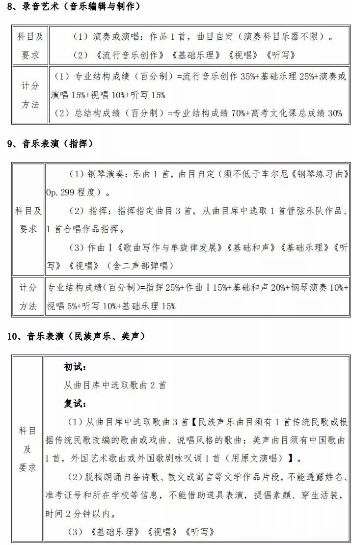 1、关于考试方式:“各招生专业考试内容和计分方法”中明确为校考“初试”的内容, 将采取线上提交视频作品的方式考试,其他复试及不分初复试校考的内容将采取到校现场考试的方式进行。”vZ7音乐培训_音乐艺考培训学校-