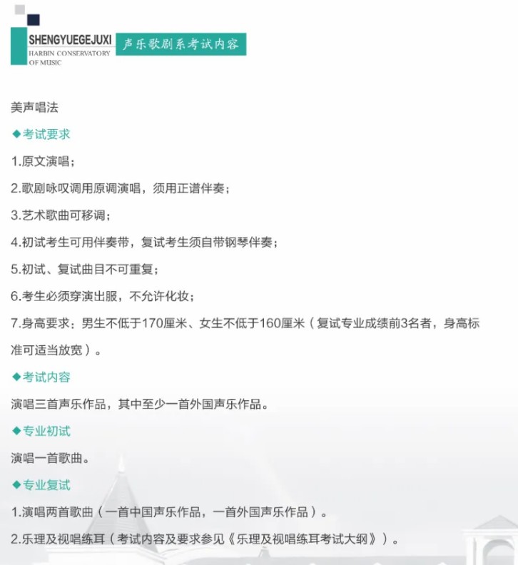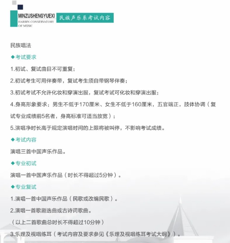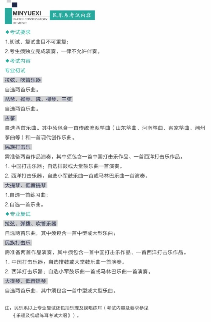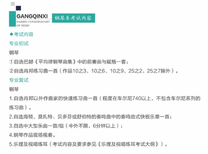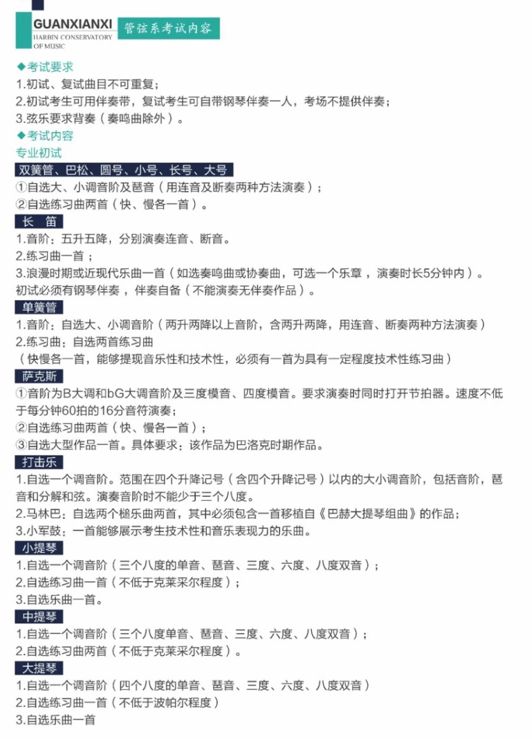 考试内容详见《招生简章》,已经在“哈尔滨音乐学院微信公众号”“哈尔滨音乐学院教务处微信公众号”公布。