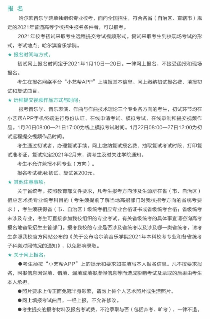 哈尔滨音乐学院2021年本科专业校考报名时间为1月10日-20日,考生可用手机在“小艺帮APP”上报名缴费。报名费每生200元,每生只能报考一个专业方向,不能兼报。