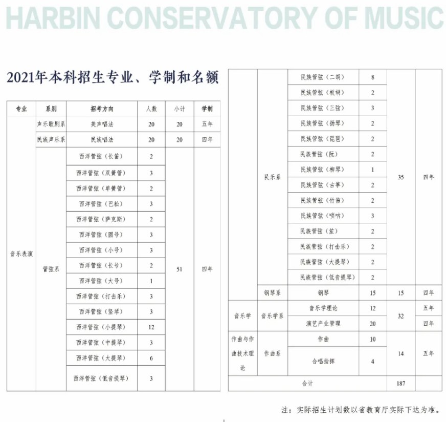 哈尔滨音乐学院2021年总招生人数187人,2020年总招生人数178人,扩招9人,变化如下: