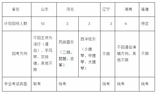 河北、辽宁、湖南、福建等地考生参加所在省2021年音乐类专业统考(考试科目以当地招生主管部门公布为准),我校不再另行举行专业测试。