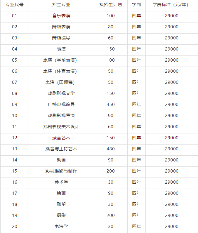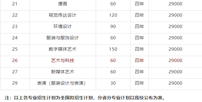 2021年艺术类本科专业招生计划表