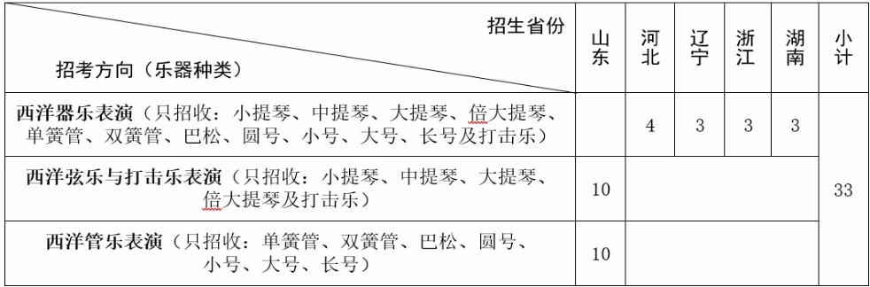 注:2021年,西洋器乐表演方向在山东省分西洋弦乐与打击乐表演、西洋管乐表演2个方向招生,请仔细对照具体的招考方向与计划数量。