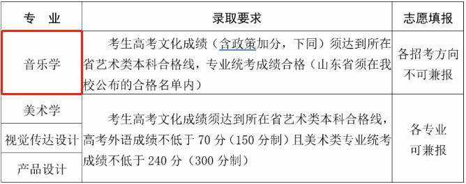 3.参加生源所在省级招生主管部门组织的艺术类专业统考(山东省音乐学专业为校级联考,以下简称联考)成绩合格。其中,音乐学专业测试主项(主科、专项等,下同)乐器或唱法须与我校招考方向要求相一致。