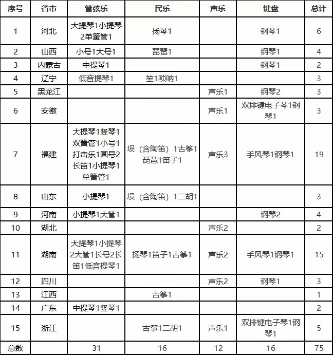 1.音乐表演专业:75人。各专业方向分省计划如下: