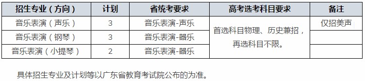 除了一些基本报考条件外,该学院还设置了一个特别的要求,那就是报考考生需符合2021年及广东省音乐类专业报考条件。也就是说在刚招生中,该学院只招收广东地区的考生。不过其他省份的考生也不必担心,随着学院的正式建立与发展,未来几年该学院也会面向考生进行招生。