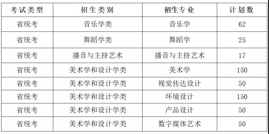 音乐学类150、舞蹈学类60、播音与主持艺术专业类60、美术学和设计学类450。