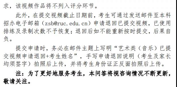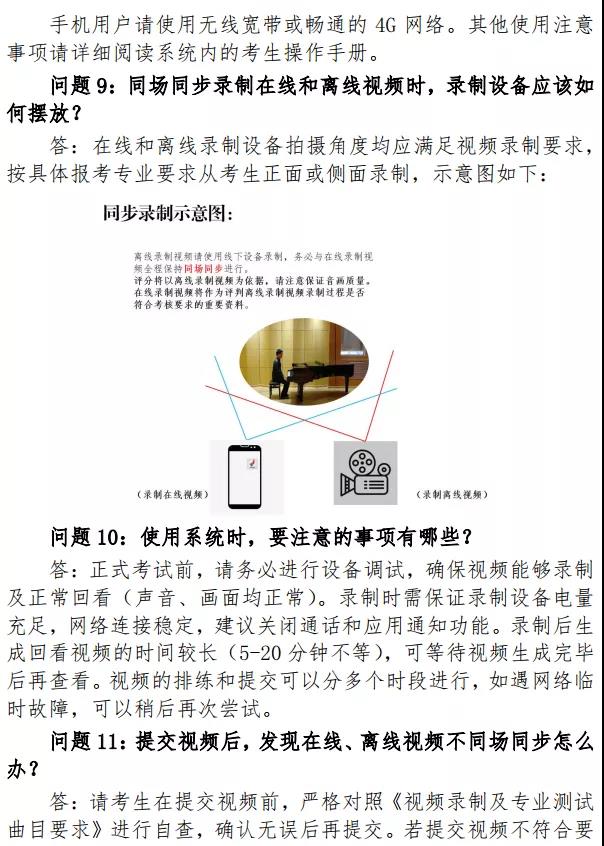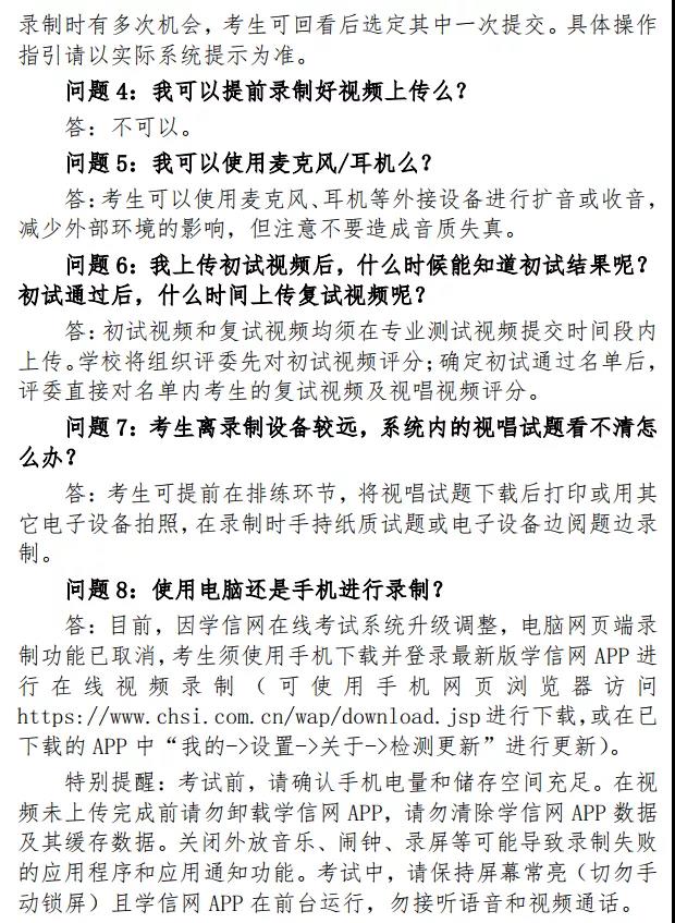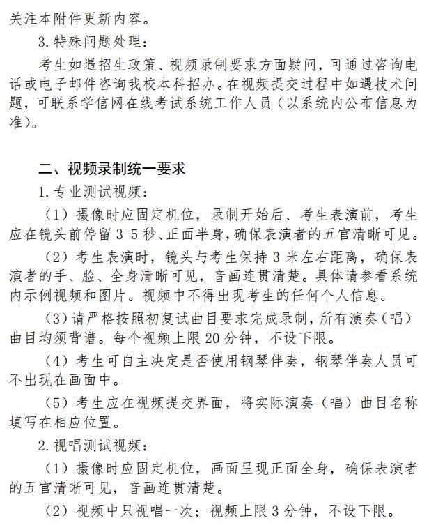 2.校考环节:考生须提交的视频包括专业测试视频和视唱测试视频。其中,专业测试视频包括初试视频、复试视频,均须在专业测试视频提交时间段内上传(不分先后)。视唱测试视频要求考生根据系统内在线试题要求在48小时内提交。