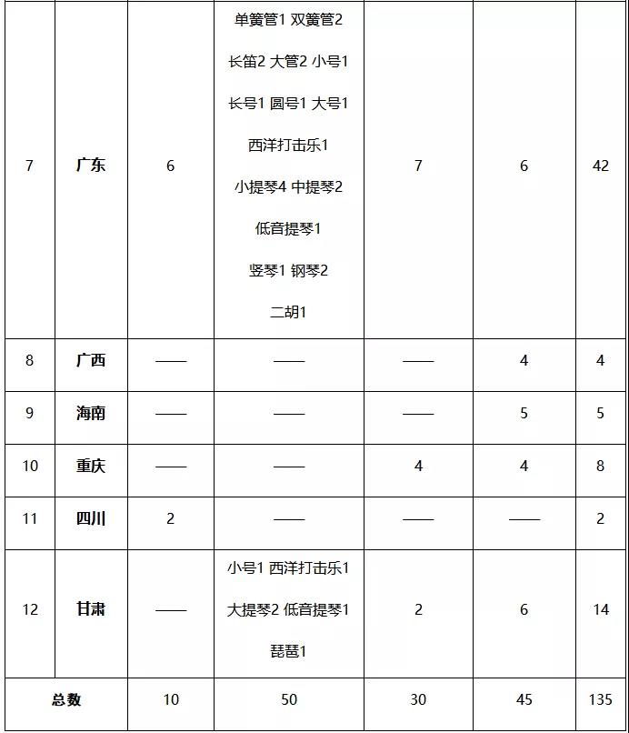 仅招小提琴、中提琴、大提琴、低音提琴、长笛、单簧管、双簧管、大管、圆号、小号、长号、大号、竖琴、西洋打击乐[不含爵士鼓]、钢琴、二胡、琵琶、中阮、竹笛、笙。