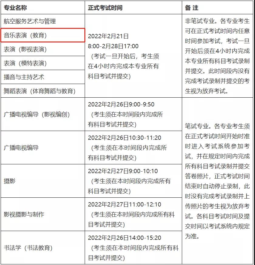 各专业正式考试时间详见下表,未按规定时间和要求参加正式考试,以及未按考试要求完成录制及提交的,后果由考生本人承担。请严格按照后期公布的各专业考试方案规定着装,准备考试场地、用具等,违反者取消考试资格。