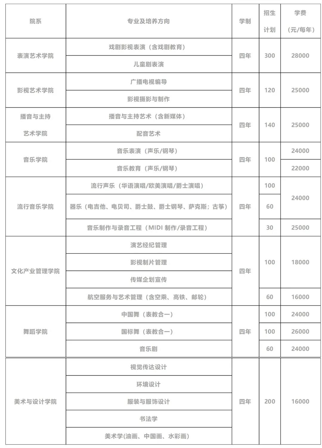 学科专业 学院开设了与文化传媒与艺术业态紧密对接的30个专业及方向,涵盖戏剧与影视学类、音乐与舞蹈学类、新闻传播学类、设计学类、美术学类、旅游管理学类等学科。设有表演艺术学院、影视艺术学院、播音与主持艺术学院、音乐学院、流行音乐学院、舞蹈学院、文化产业管理学院、美术与设计学院、国际交流学院、航空旅游系、综合基础部等教学单位。