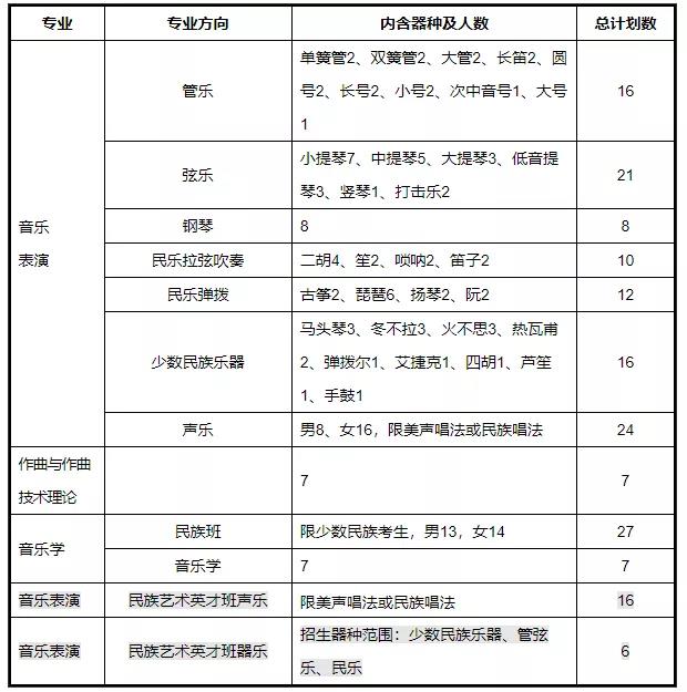 2.音乐表演专业声乐方向(分男女)、器乐各方向(分器种)、民族艺术英才班(分声乐类和器乐类)根据校考成绩全国排名,按照招生计划1:1的比例确定分省计划和校考合格名单。