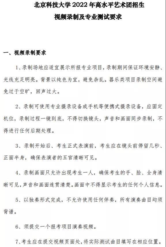 请通过初审的考生,于2022年2月28日-3月7日,登录学信网“在线考试系统”(https://bm.chsi.com.cn/),按照要求在线录制并提交测试视频,线下录制提交的视频无效,不接受通过其他平台或渠道提交的视频。请考生务必仔细阅读《北京科技大学2022年高水平艺术团招生视频录制及专业测试要求》(详见附件),严格按要求提交作品。