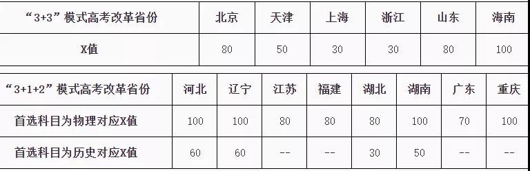 对于按照上述要求报考我校的高考改革省份签约考生,高考文化课成绩须达到考生所在省份确定的高水平艺术团相关最低录取控制参考分数线上X分及以上(各省份X值请见下表),同时考生选考科目须满足所报考专业的选考科目要求,方可被我校录取。