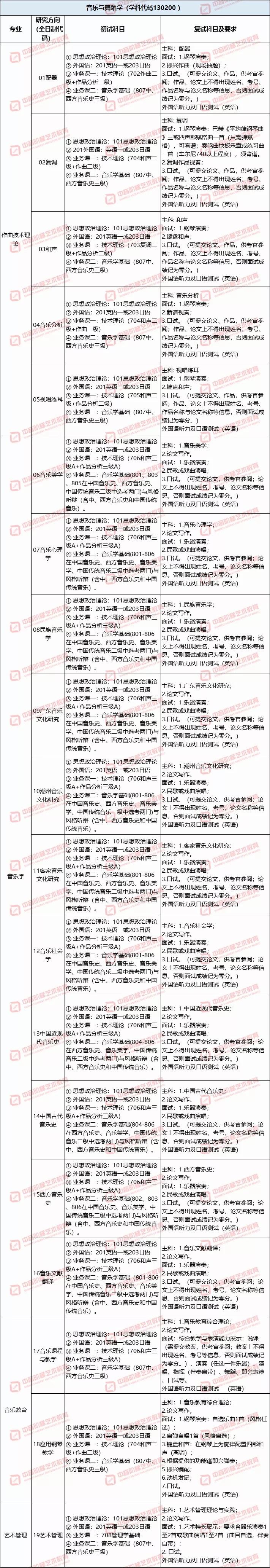 注:1.初试科目中的和声、作品分析、中国音乐史、西方音乐史等专业基础课程,其考试内容按不同专业方向的难易程度分级确定考试标准。